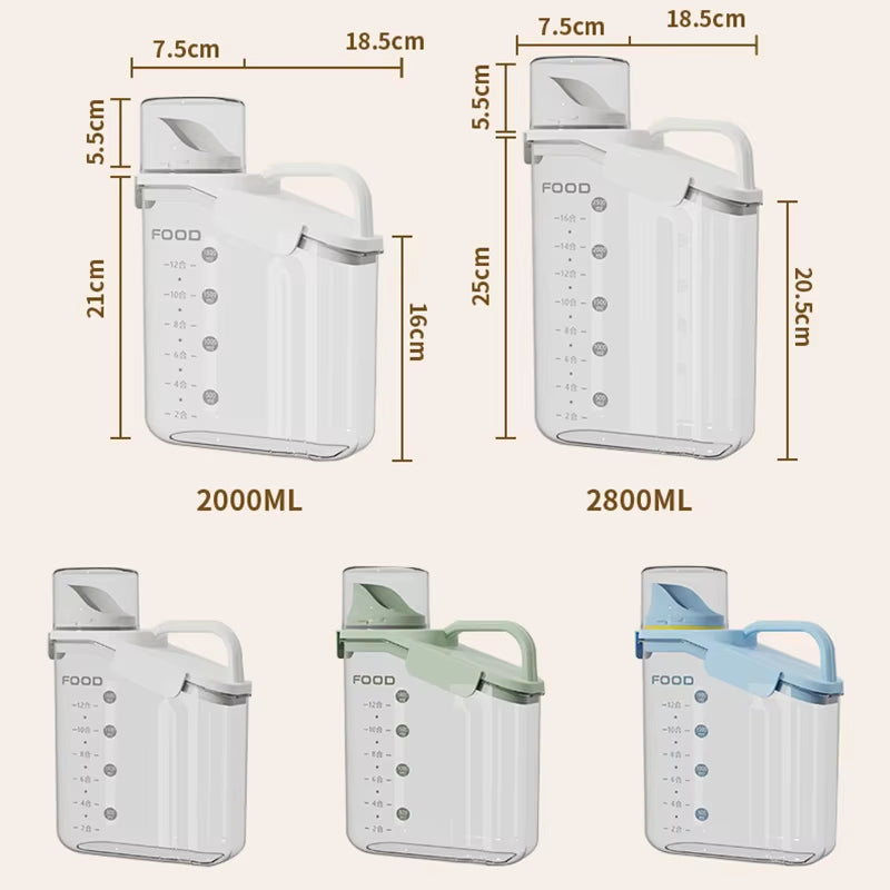 3. The storage bin is designed with a pour spout and a measuring cup on the top of the jar, the measuring cup can be screwed on the pouring mouth, making your use more convenient.