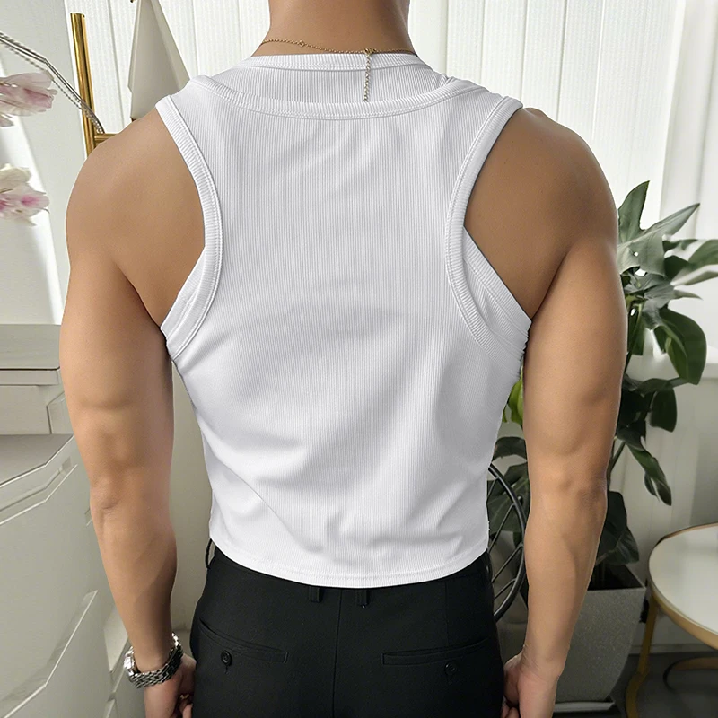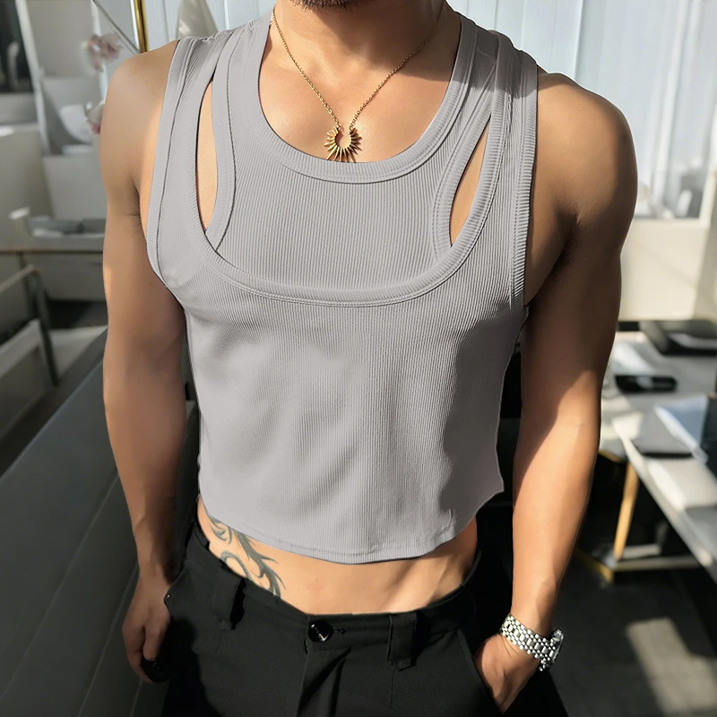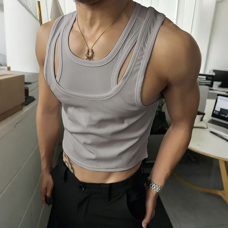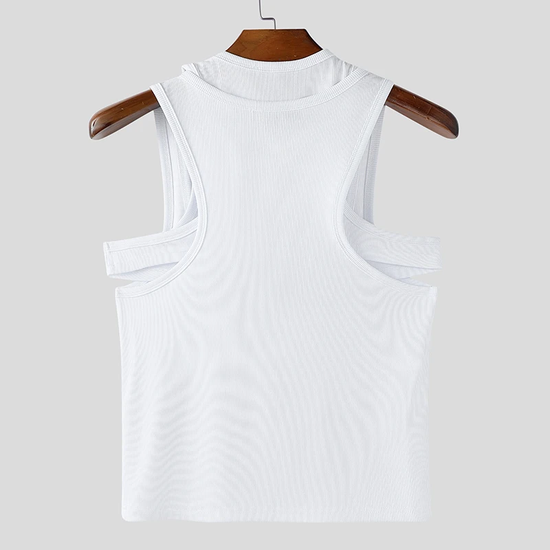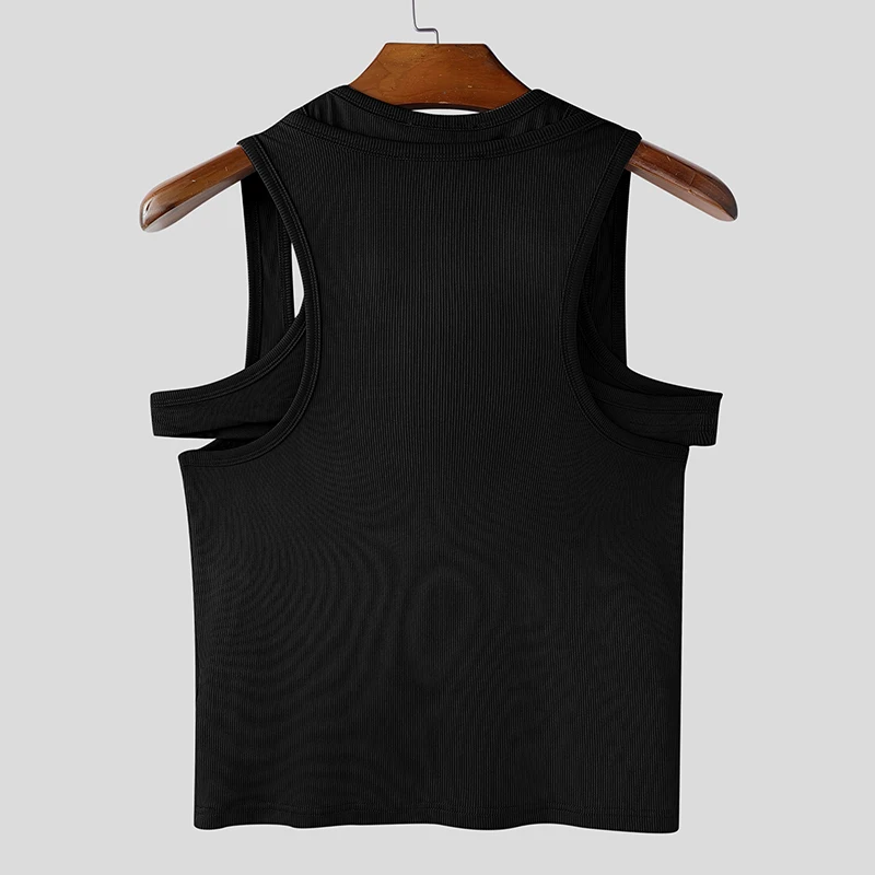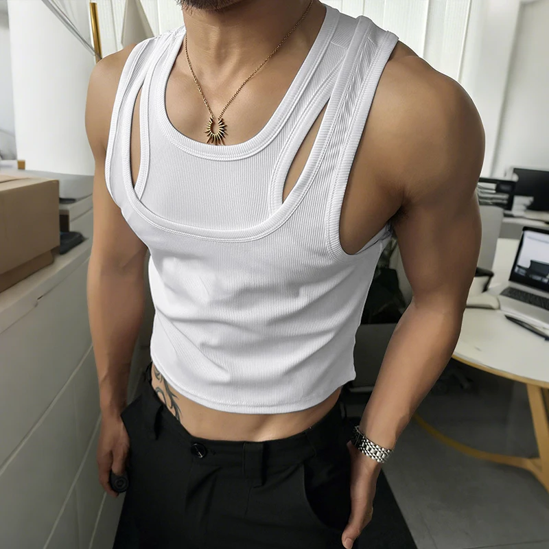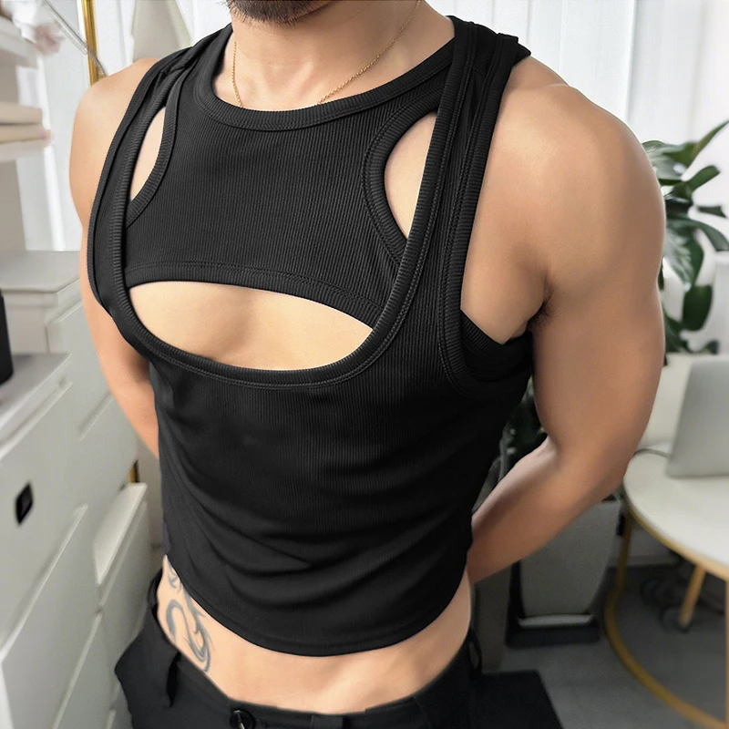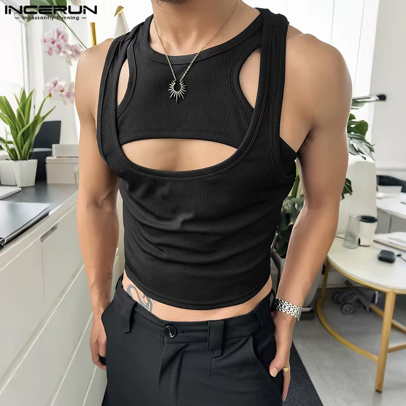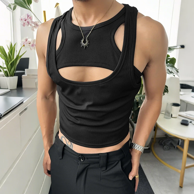 Men Tank Tops Solid Color Hollow Out O-Neck Sleeveless Male Vests Summer Streetwear 2025 Sexy Fashion Men Clothing S-3XL