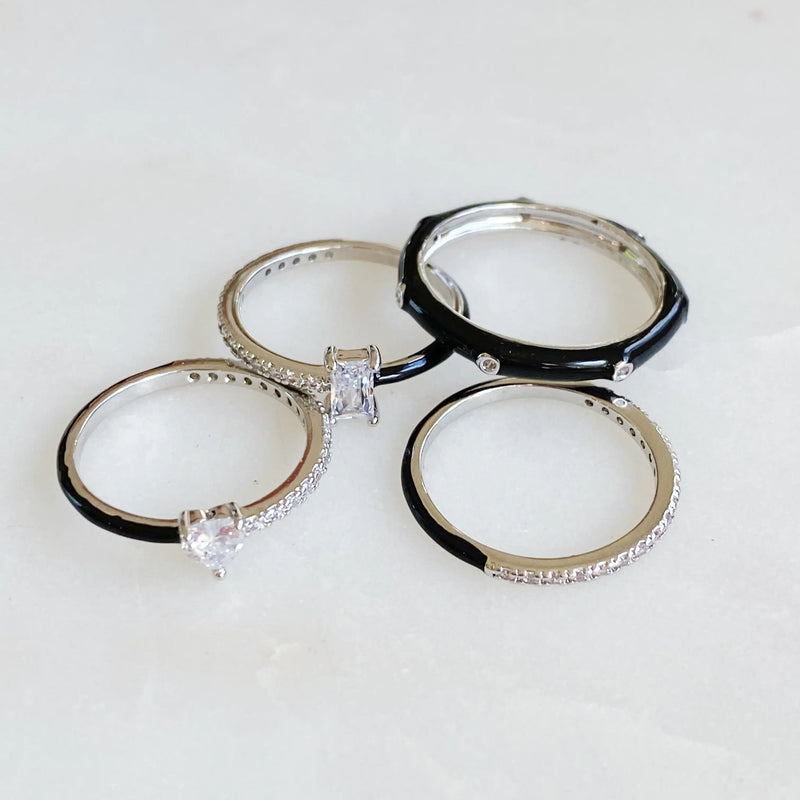 Beautiful 4 rings come in this set. 3 rings in size 5, 1 ring in size 7. Can be worn together or separately. Each ring has pretty design with enamel and rhinestone details.